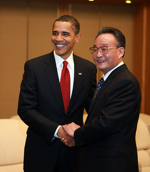 11月17日,中國全國人大常委會(huì)委員長吳邦國在北京人民大會(huì)堂會(huì)見美國總統(tǒng)奧巴馬。 新華社記者鞠鵬攝