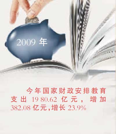 2009年,國家財政投入教育1980.62億元,增長23.9%,向“確保人人享有平等的受教育機會,不讓一個孩子因家庭經濟困難而失學”的目標邁進。