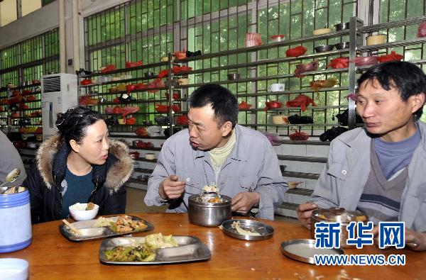 農(nóng)民工全國人大代表胡小燕——為全國兩會(huì)做好準(zhǔn)備胡小燕(中)在公司生產(chǎn)車間食堂和工友們交流(2月16日攝)。在廣東佛山打工十幾年,胡小燕獲得過公司所在地白坭鎮(zhèn)“十佳外來工”、三水區(qū)“十佳外來工”、佛山市“十佳外來工”稱號(hào),2008年1月21日,經(jīng)過廣東省十一屆人大一次會(huì)議第三次全體會(huì)議無記名投票,她成為中國第一位農(nóng)民工全國人大代表。胡小燕現(xiàn)在在佛山市三水新明珠建陶工業(yè)有限公司工作。在完成日常工作的同時(shí),她認(rèn)真地履行職責(zé)。去年兩會(huì),她提交了5項(xiàng)涉及農(nóng)民工權(quán)益的建議,諸如醫(yī)保轉(zhuǎn)移、子女教育、技能培訓(xùn)、工傷賠付等。一年來,她所關(guān)注的還是農(nóng)民工子女入學(xué)、空巢老人等與農(nóng)民工息息相關(guān)的議題。全國兩會(huì)在即,胡小燕也在積極為兩會(huì)做著最后的準(zhǔn)備。新華社記者 陳曄華攝