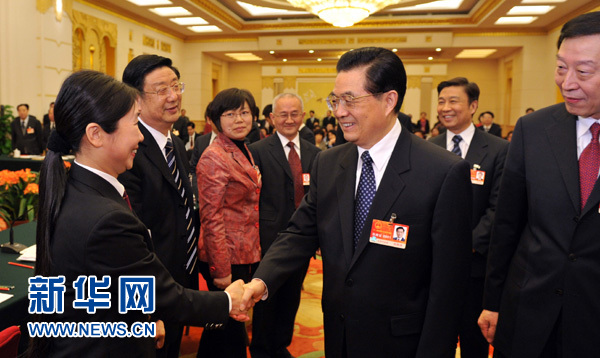 3月5日,中共中央總書(shū)記、國(guó)家主席、中央軍委主席胡錦濤參加十一屆全國(guó)人大四次會(huì)議江蘇代表團(tuán)的審議。這是胡錦濤同代表們親切交談。新華社記者黃敬文攝