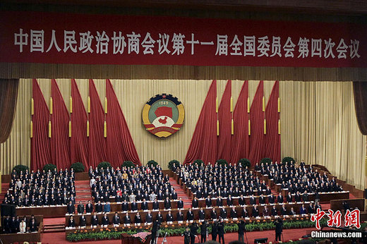 3月3日下午3時,全國政協十一屆四次會議在北京人民大會堂開幕。中新社記者 盛佳鵬 攝