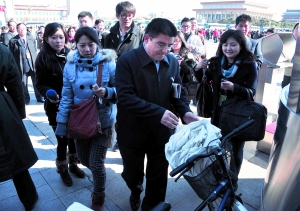 昨日,陳光標(biāo)騎著自行車趕赴會(huì)場(chǎng),并攜帶了幾個(gè)環(huán)保袋,發(fā)給采訪他的記者和參會(huì)政協(xié)委員。記者 陳杰 攝