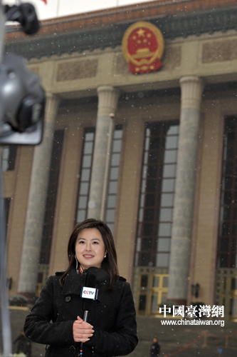 中央電視臺記者張泉靈一大早就到了人民大會堂前做報道。 (中國臺灣網發 肖春陽、劉洋攝)