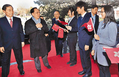 特首曾蔭權(quán)(左二)抵達(dá)北京大學(xué)校園,受到學(xué)生歡迎。圖片來源:香港文匯報(bào)
