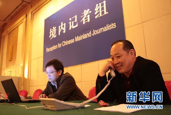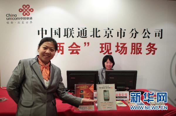 2月26日,中國聯通北京分公司的員工宋欣(左)在新聞中心值班。第十一屆全國人民代表大會第四次會議和中國人民政治協商會議第十一屆全國委員會第四次會議,將分別于2011年3月5日和3月3日在北京開幕。十一屆全國人大四次會議、全國政協十一屆四次會議在北京西長安街北側的梅地亞中心設立新聞中心,負責接待和安排中外記者對會議的采訪。新華社記者 邢廣利攝
