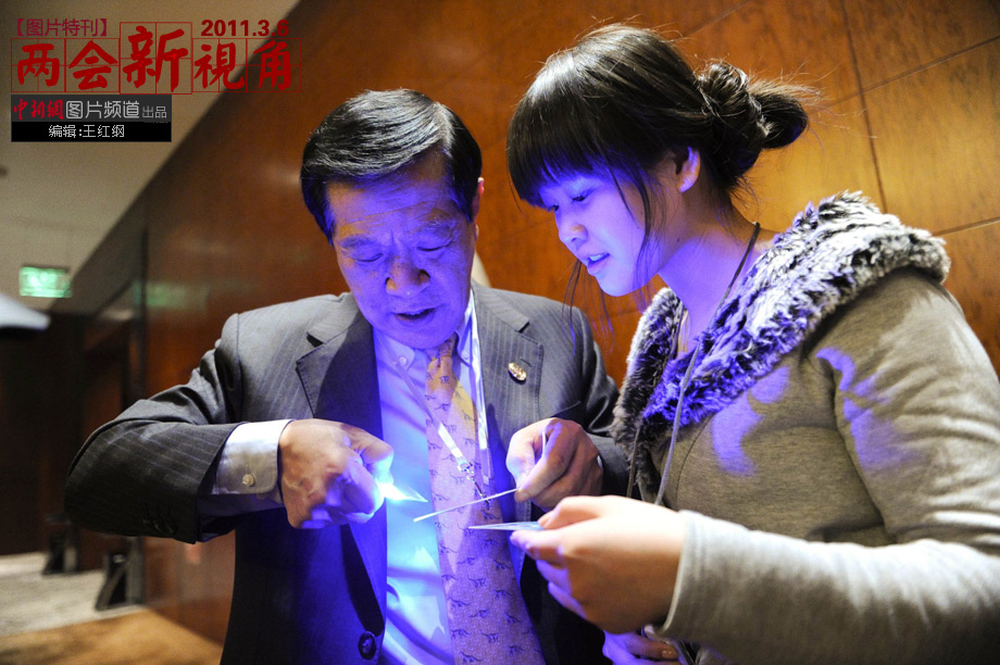 3月6日,作為海外僑胞列席全國政協十一屆四次會議的華人“神探”李昌鈺,在會議間隙向采訪他的記者贈送他自己研制的光波鑒識器。李昌鈺因鑒識過辛普森殺妻案、9·11恐怖襲擊事件、臺灣3·19槍擊案等大案而名震全球。中新社記者 廖攀 攝