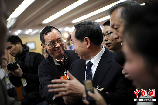 3月7日,教育部部長袁貴仁參加全國政協教育界小組討論,聽取委員意見。會后,袁貴仁受到記者圍堵追訪,南方科技大學校長朱清時委員為袁貴仁開道。此前,朱時清宣稱要在中國打造一所“教授治校”的大學,這位前中國科技大學校長在教育部未批復的情況下,擅自拍板:自主招生、自授文憑。近日,這所大學已經迎來了它的第一批學生。中新社發 廖攀 攝