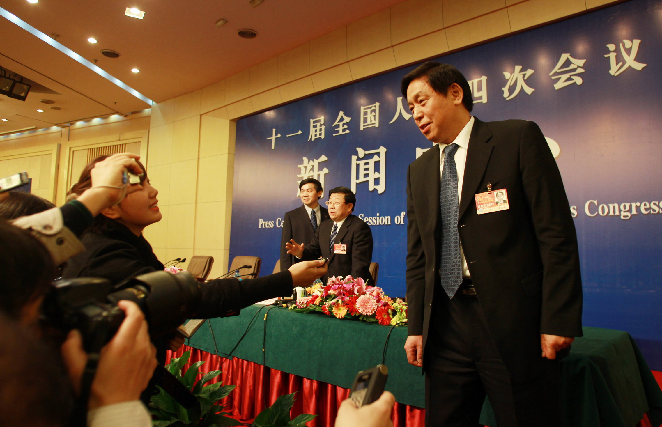 圖為貴州省委書記栗戰書在記者會后被記者包圍采訪。本報記者 周維海攝