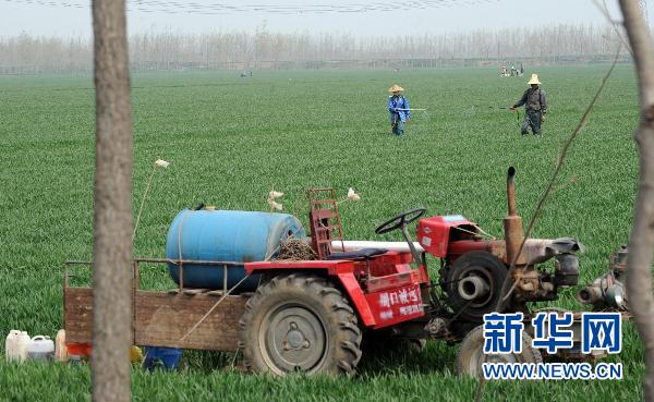 這是河南省周口市黃泛區農民徐耀偉夫婦在承包的麥田噴灑農藥(2010年4月7日攝)。 新華社記者 趙鵬攝