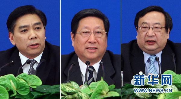 3月6日,國家發展和改革委員會主任張平(中)、國家發展和改革委員會副主任朱之鑫(右)與國家發展和改革委員會副主任徐憲平回答記者提問。當日,十一屆全國人大四次會議在北京人民大會堂金色大廳舉行記者會,國家發展和改革委員會負責人就“十二五”規劃綱要回答記者提問。新華社記者邢廣利攝