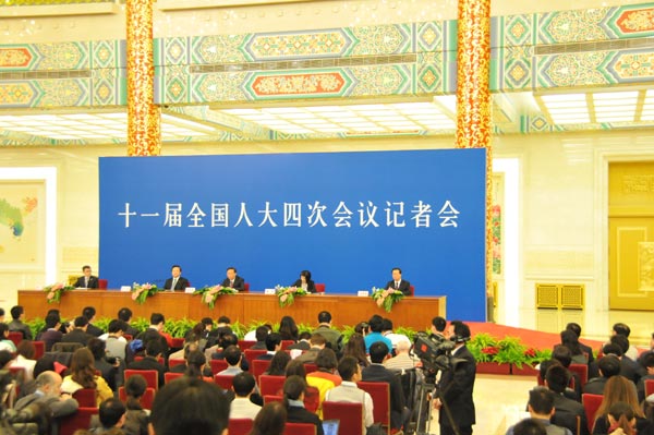 3月7日上午10時,十一屆全國人大四次會議在人民大會堂三樓大廳舉行中外記者會,由外交部部長楊潔篪就外交政策和對外關(guān)系問題答記者問。圖為記者會現(xiàn)場。宋君毅 攝