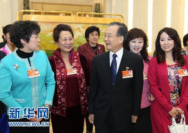 3月8日,中共中央政治局常委、國務院總理溫家寶參加十一屆全國人大四次會議吉林代表團審議。會前,溫家寶與女代表親切交談,向她們致以節日祝賀。新華社記者鞠鵬攝