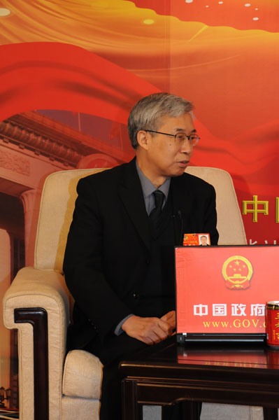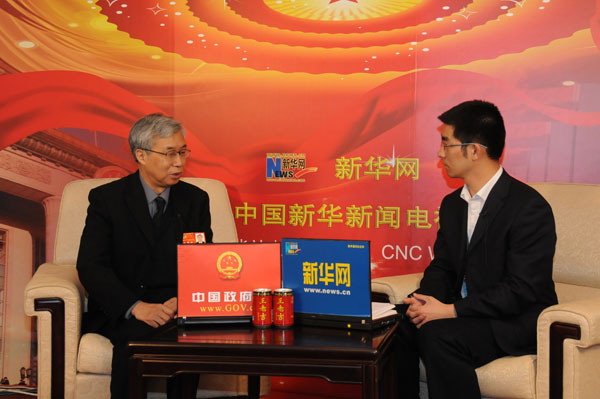 2011年3月9日9時,全國政協十一屆四次會議舉行第三次全體會議,委員大會發言。圖為全國政協委員歐陽鐘燦在訪談間接受新華網、中國政府網現場采訪。他表示,我國液晶顯示產業一定能后來居上。宋巖 攝