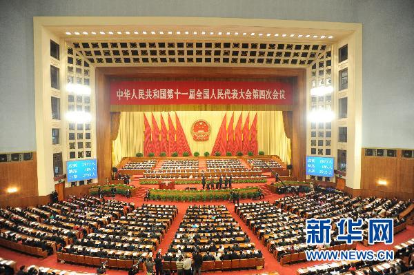 3月11日,十一屆全國(guó)人大四次會(huì)議在北京人民大會(huì)堂舉行第三次全體會(huì)議。 新華社記者謝環(huán)馳攝