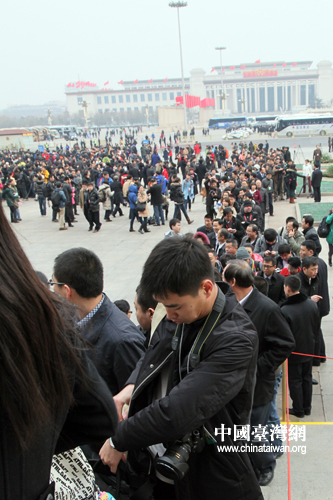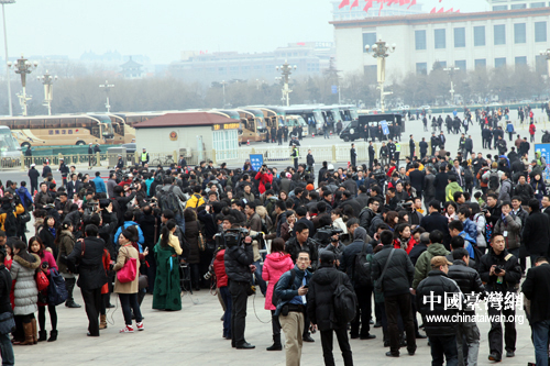 記者排隊進入人民大會堂,強大的媒體報道隊伍把大會的聲音傳向世界。