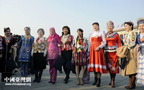 少數民族代表在人民大會堂前合影留念 (中國臺灣網 發(fā))