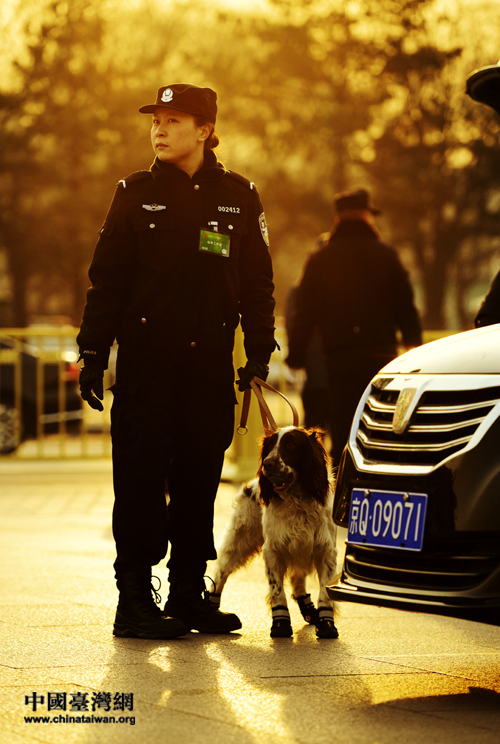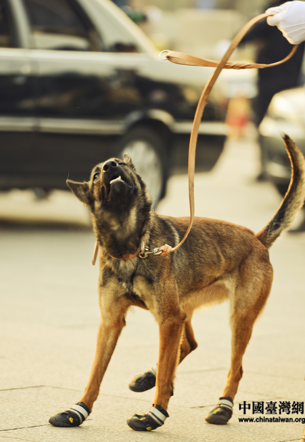 兩會期間,當清晨第一縷陽光射向天安門廣場,擔負搜暴任務的警犬,在警務人員帶領下,“腳”穿制式“鞋子”,防止在搜索中劃破車漆,體現了更為人性的服務細節。