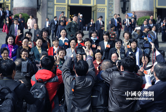 在天安門廣場上,女委員成為媒體記者追捧的焦點。(中國臺灣網 發)