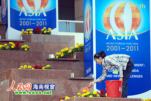 博鰲亞洲論壇2011年年會即將拉開帷幕,4月13日下午,博鰲索菲特大酒店門前鮮花錦簇,工作人員將會場打扮一新。設(shè)在酒店康樂中心的媒體新聞中心已經(jīng)進(jìn)入“備戰(zhàn)”狀態(tài)。