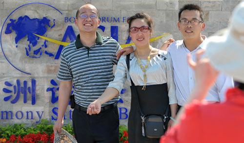 4月9日,游客在博鰲亞洲論壇永久會(huì)址前合影留念。