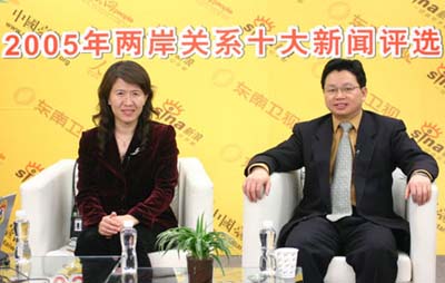 由中國臺灣網、人民網、新浪網、東南衛視聯合推出的“2005年兩岸關系十大新聞”評選活動于2006年1月1日正式啟動。作為評選活動的重要組成部分,1月17日13時至14時,全國臺聯聯絡部部長、前全國臺聯研究室副主任、全國臺灣研究會理事楊毅周教授(右),社科院臺灣研究所政治研究室主任謝郁(左)就臺商春節包機、送臺六項大禮等問題接受在線訪談。