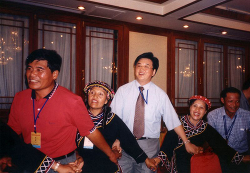 徐剛主任在瓊臺少數民族交流活動中,與臺灣少數民族同胞一起載歌載舞。(資料照片)