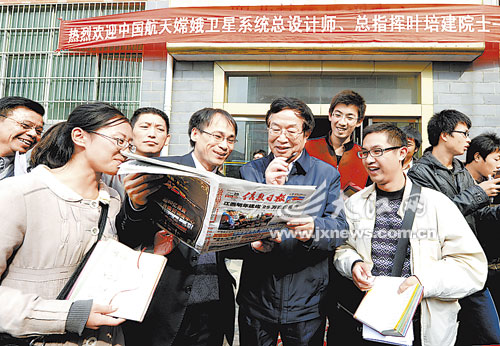 “《信息日報》,哦,知道,知道……”當葉培建院士講學結束時,記者將今年10月8日刊發有《嫦娥二號軌道一次修正到位——多名航天專家為本報讀者解讀我國第二顆探月衛星》報道的報紙送到他的面前。葉培建院士拿著這份《信息日報》,饒有興趣地看了起來。當看到他向記者介紹“嫦娥二號”的有關內容時,他看得很仔細,還用筆在文字下畫起了線條。