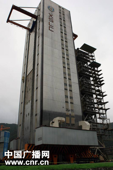 搭載著嫦娥二號繞月衛星的長三丙火箭已進入二號發射塔架。紀樂樂攝(圖片來源:中廣網)