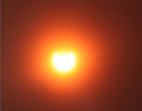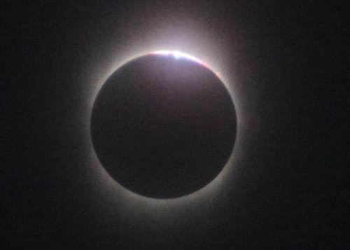 天空越來越暗,主持人停止了講解,只有忽然而過的風與楊柳上的知了時不時的碰撞出“吱嗚”的聲音,在場的人們拿起自己手中的望遠鏡、相機用力的透過鏡頭看著空中。漸漸的,天空亮出一圈淡淡的光環,接著凸出一顆、兩顆的小光點!翱矗鞘秦惱椤庇腥思拥暮爸。天空光明大作,太陽再次慢慢的展現出它的全貌,全場歡呼不絕于耳。