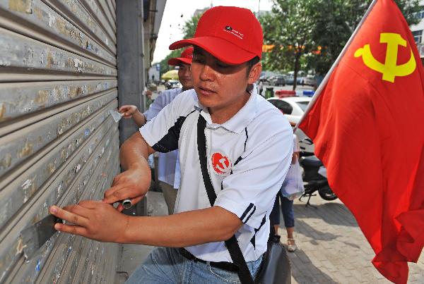 6月28日,黨員志愿者服務隊在街頭清除小廣告。 “七一”前夕,寧夏開展黨員志愿者服務行動,組織機關、企事業單位黨員到街頭開展志愿服務工作。 新華社記者 王鵬攝