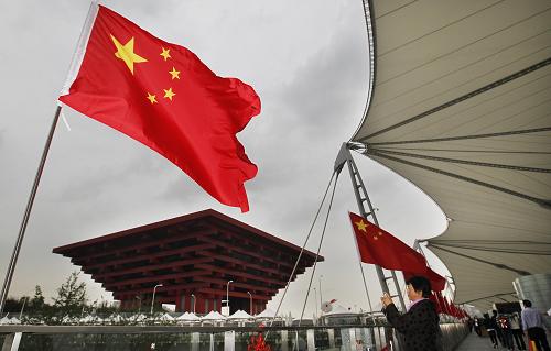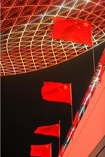 9月28日晚,世博軸陽(yáng)光谷旁的國(guó)旗迎風(fēng)招展。新華社記者 徐昱 攝