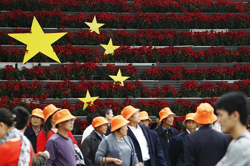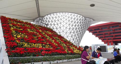 9月29日,游客在世博軸上一處“國(guó)慶”字樣的花壇旁小憩。新華社記者 裴鑫 攝