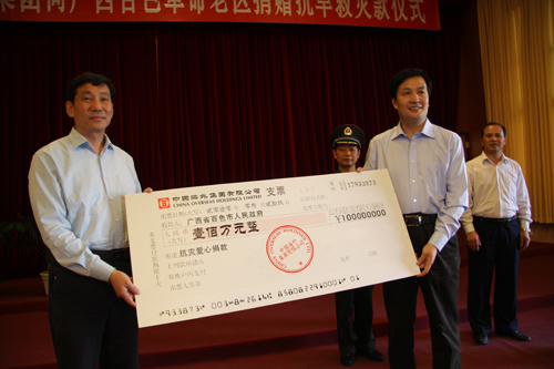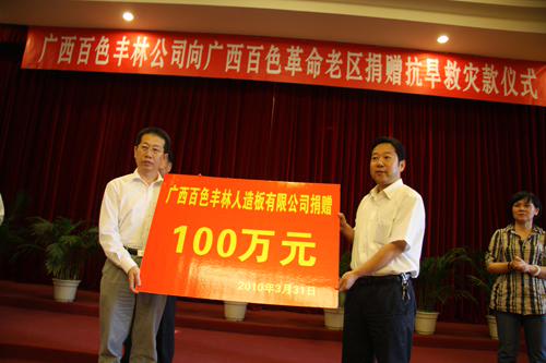 人民網百色3月31日電 (記者龐革平、謝建偉)3月31日下午,香港中國海外集團有限公司和廣西百色豐林人造板有限公司分別向廣西百色災區捐款100萬元。此前,上海浦東發展銀行股份有限公司已向百色市捐款50萬元,百色軍分區及所屬部隊官兵則為百色市捐款10.29萬元。