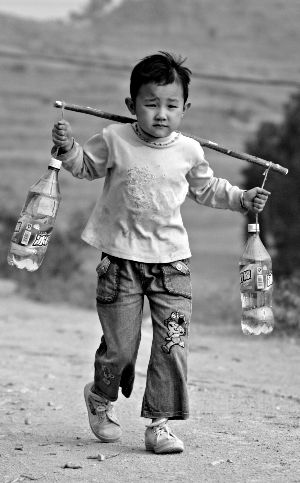 近日,云南石林縣大石橋村,送水車來了,6歲的小孩楊云潤用飲料瓶幫家里人挑水。黃興能 攝