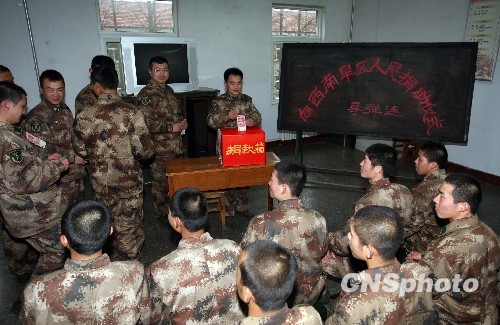 3月31日,駐豫某部7000余名團員青年向西南旱區捐款。近日,濟南軍區駐豫某部動員廣大團員青年大力弘揚我軍優良傳統,向西南旱區群眾伸出援助之手,以捐款方式每人捐助1瓶飲用水,以實際行動為奪取抗旱救災斗爭勝利作貢獻。同時,對受災嚴重的官兵家庭,采取措施給與救助。中新社發 陳新文 攝