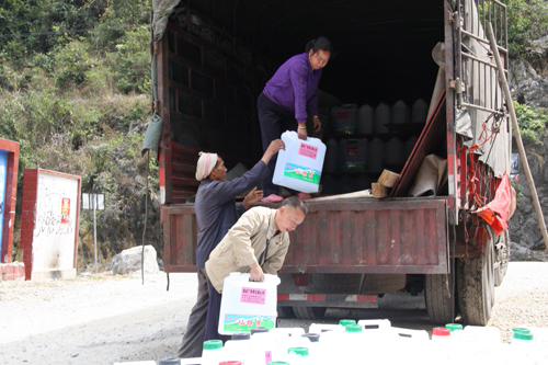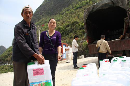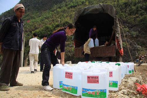 4月1日下午,中國婦女發展基金會、中國兒童少年基金會、廣西壯族自治區婦女聯合會給廣西百色旱區捐贈價值100萬元的“愛心水”。圖為凌云縣婦聯工作人員將6噸“愛心水”發放給該縣泗城鎮隴浩村隴照屯村民。(龐革平 高九江 攝影報道)