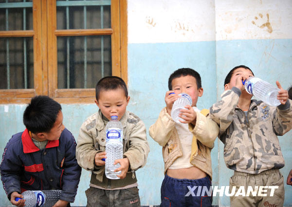 3月30日,天峨縣坡結(jié)鄉(xiāng)龍鳳村完全小學(xué)的同學(xué)們在品嘗剛剛領(lǐng)取的純凈水。