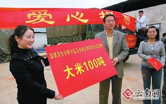 26日,茅臺(tái)酒在云南的經(jīng)銷商齊聚昆明涼亭,將滿載愛心的100余噸大米發(fā)往云南省受災(zāi)最為嚴(yán)重的10個(gè)縣,駐滇某集團(tuán)軍炮兵旅承擔(dān)了運(yùn)輸大米的任務(wù)。