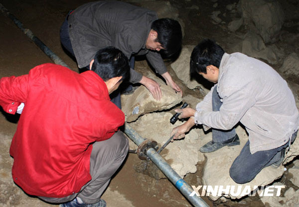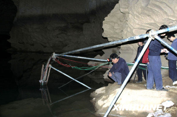 廣西鳳山縣江洲瑤族鄉巴標村群眾日前在黃泥巴峒屯一個深600多米的山洞里發現了地下水。鳳山縣及時組織水利、農機、電業、水廠等有關部門和單位,架設管路、安裝抽水設備,準備把水引到巴標、鳳平等村。抽水管路開通后將可以解決3000多人的生活用水和1100多畝耕地的澆灌問題。預計安裝調試工作在兩天后完成。新華社發(周恩革 攝)