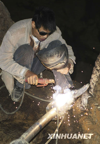 3月25日,工人在鳳山縣江洲瑤族鄉巴標村黃泥巴峒屯一個深600多米的山洞中焊接水管。 新華社發(周恩革 攝)