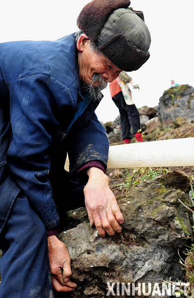 3月24日,在貴州省平壩縣城關鎮大關村,84歲的楊紹華老人和同村群眾一起在新的水源點建水池。貴州省安順市平壩縣城關鎮大關村有296戶人家,1566人。百年不遇的持續干旱使這個小山村春節前就斷了水源。在大災面前,村黨支部書記邱繼明自己拿出1.2萬元錢,帶領全村的群眾找到兩個水源點,鋪設管道,把水引到群眾家里。但持續干旱使群眾的生活用水只維持到3月10日。斷水之后,邱繼明又用車為群眾運水。3月16日,在距離村子兩公里遠的大山里找到一處新的水源點后,邱繼明又拿出5萬元錢,帶領全村群眾開始建新水池。在大災面前,邱繼明慷慨解囊、一心為民、百折不撓的精神鼓舞和感動著當地的群眾,全村男女老少都積極參與修建水池。村民們都說:“再大的災害不怕,前面有邱支書撐著!”新華社記者楊楹攝
