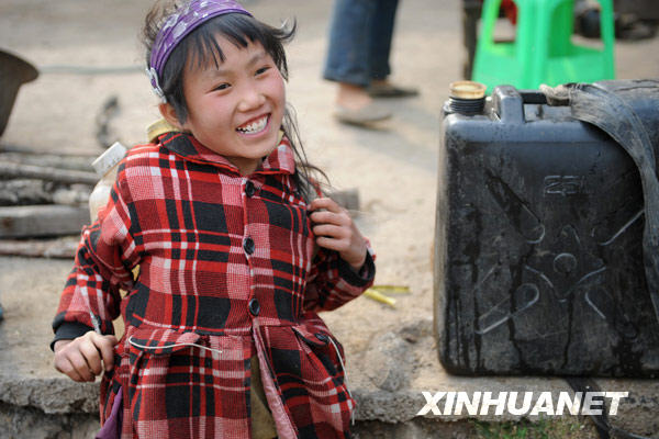 11歲的熊?chē)?guó)珍來(lái)幫姐姐熊?chē)?guó)麗背水,她說(shuō)自己還小,只能背20斤重的水桶(3月27日攝)。