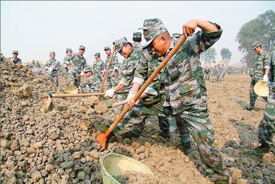 小海子壩塘是草壩鎮波黑村280戶村民賴以生存的“生命之源”,該村村民的生活用水和2000多畝土地的生產用水都靠它,旱情的加深使得該壩塘干枯見底。在千方百計確保群眾飲水的同時,縣、鄉黨委、政府決定利用壩塘干枯擴容修渠,大興水利建設。面對這一重任,空軍某部主動請纓,共出動官兵550人、工程車等車輛35輛開赴波黑村,投入清淤擴容、興修水利抗旱促春耕戰斗中。目前,已挖掘清理龜裂土方約2.8萬立方米。