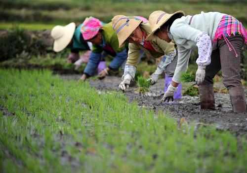 4月28日,大理市喜洲鎮的村民正在插秧。春耕時節,遭遇嚴重旱情的云南省全力做好抗旱保春耕工作,各地及時調整種植結構,并抓好農作物的田間管理。近期,少量的降雨使大理白族自治州部分地區旱情得到一定緩解,當地群眾抓住有利時機搶插秧苗。新華社記者 秦晴 攝