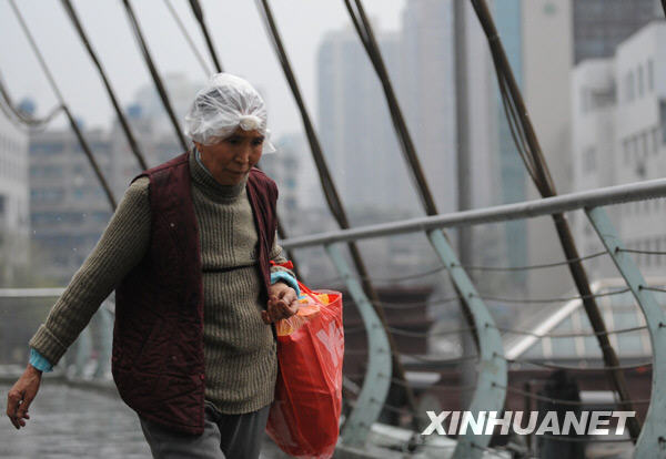 3月20日,貴陽街頭一位老人用塑料袋擋雨前行。