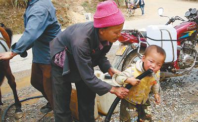 3月21日,廣西百色市右江區大楞鄉弄外村瑤族村民黃秀青到取水點后,立即取水給3歲的小孫子黃河解渴。人民網記者 龐革平 謝建偉攝影報道