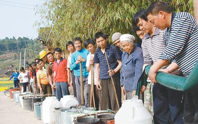 3月21日下午,貴州宅吉鄉潘桐村簡家灣組村民有秩序地排好隊,接水回家。人民網記者 汪志球攝
