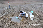貴州省貴陽(yáng)市開(kāi)陽(yáng)縣飲用水源翁井水庫(kù)干涸見(jiàn)底,圖為水庫(kù)附近的青西村村民在水庫(kù)庫(kù)底取水。中新社發(fā)曹多然 攝