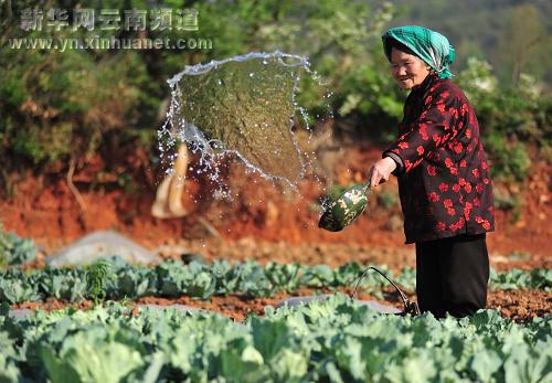 4月9日,曲靖市沾益縣西平鎮青山崖村老人陳世花在田間澆地。