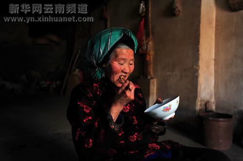 4月9日,曲靖市沾益縣西平鎮青山崖村老人陳世花在家中吃午飯。